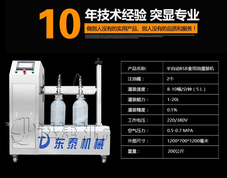 本機適用于花生油、大豆油、菜籽油、色拉油、芝麻油、石油化工潤滑油等各種油類和粘稠液體的定量要求。半自動雙頭電動BSB食用油灌裝機:采用的微電腦技術,自備動力,管路無需加壓,節約運行成本;自動檢測油浙、自動修正溫度變化引起的密度變化,適合大溫差環境的油品灌裝工作,使用方便靈活;機電一體化設計,安裝方便,整機價格低廉。