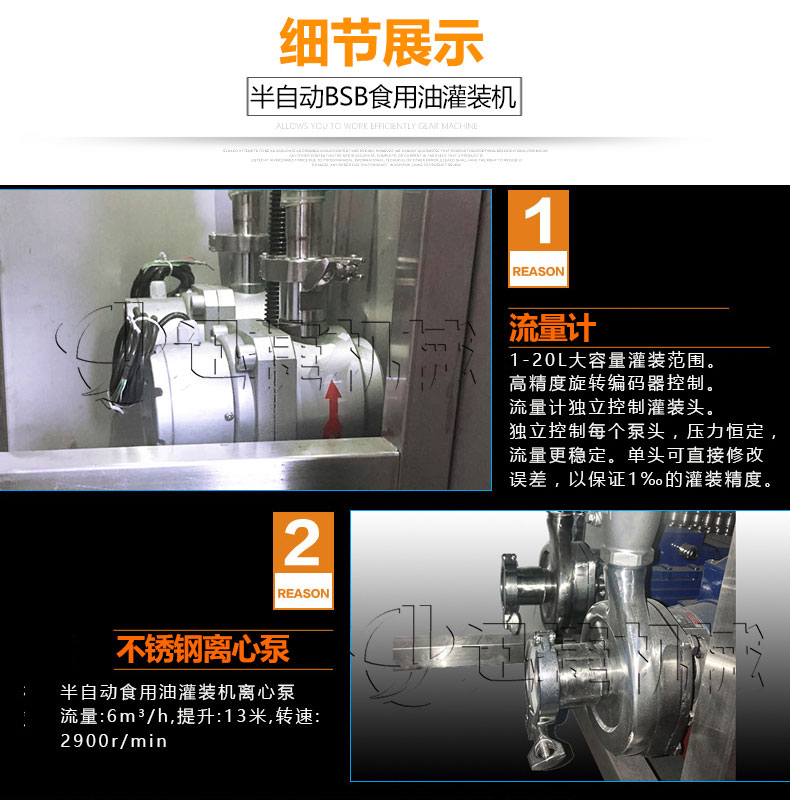 1-20L大容量灌裝范圍,高精度旋轉編碼器控制。流量計控制灌裝頭,控制每個泵頭,壓力恒定,流量更穩定,單頭可直接修改誤差,以1‰的灌裝精度。不銹鋼離心泵半自動灌裝機離心泵流量6m3/h,揚程13米,速度2900r/min