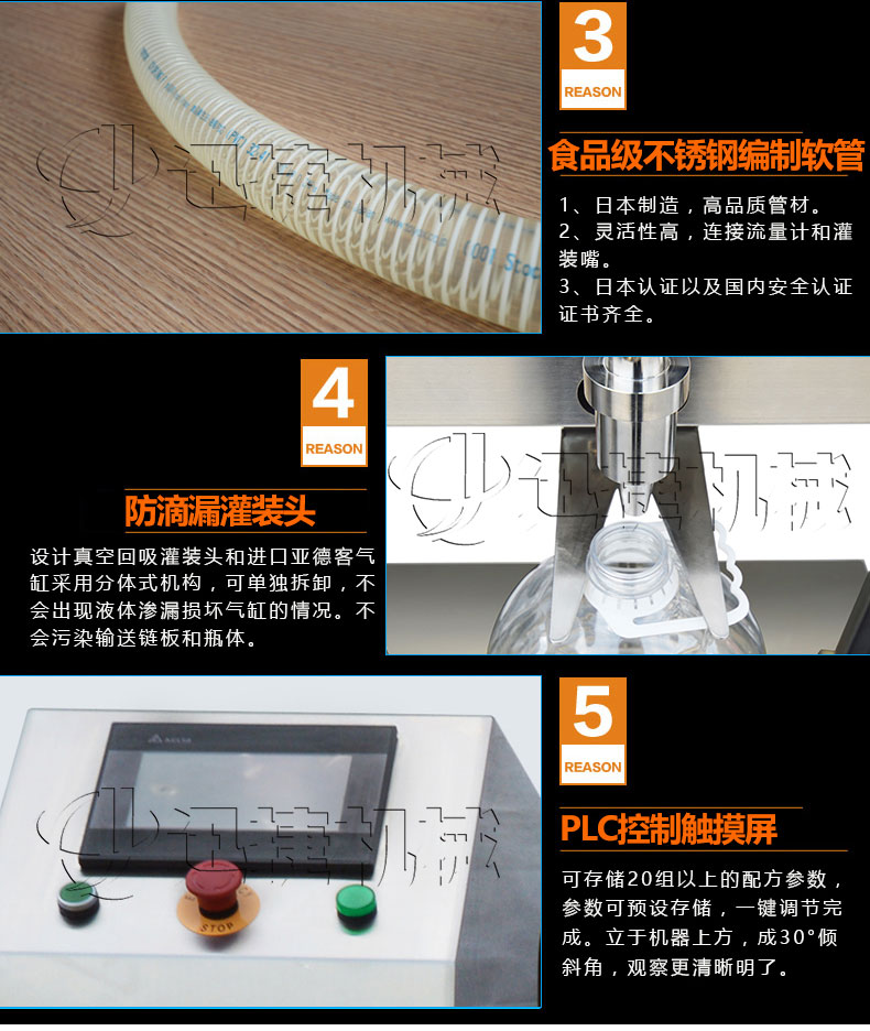 4、獨特的灌裝頭設計及真空回戲系統,確保現場及包裝成品免受殘液污染,先快后慢雙速灌裝量可設備調節,解決了泵壓快速灌裝時的溢瓶現象。