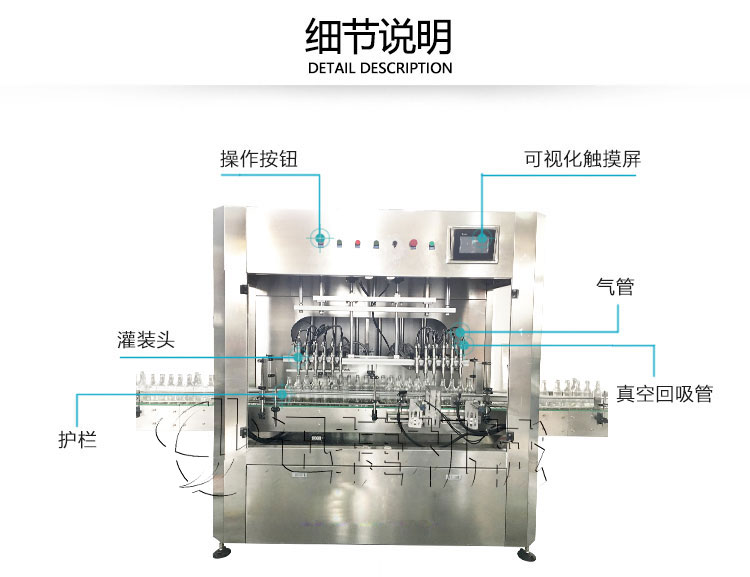 4、獨(dú)特的灌裝頭設(shè)計(jì)及真空回戲系統(tǒng),確保現(xiàn)場(chǎng)及包裝成品免受殘液污染,先快后慢雙速灌裝量可設(shè)備調(diào)節(jié),解決了泵壓快速灌裝時(shí)的溢瓶現(xiàn)象。